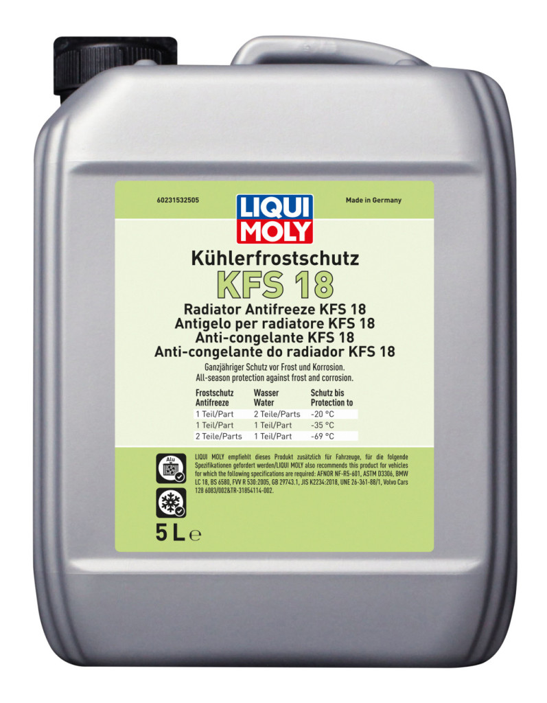Alkalmazás: Tisztítsa meg a hűtőrendszert LIQUI MOLY hűtőtisztítóval (cikkszám: 8383). Ezután ürítse ki és öblítse át bő vízzel. Töltse fel KFS 18 hűtőfolyadékkal és fagyállóval, valamint vízzel a keverési táblázat és a gyártó utasításai szerint. Ehhez desztillált vizet ajánlunk. A víz keménységétől és minőségétől függően csapvízzel is hígítható. Ártalmatlanítás a helyi előírásoknak megfelelően. Csereintervallum a gyártó utasításai szerint. Csak hígítatlanul tárolandó. Etilénglikol alapú hűtőfolyadékokkal keverhető.