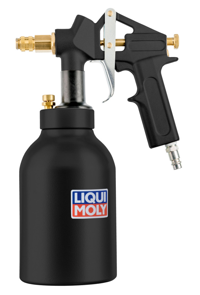 Porszórással bevont alumínium tartály a kereskedelemben elterjedt sűrítettlevegő-csatlakozóval és visszacsapó szeleppel. 1 l töltőmennyiség. A szabályozószeleppel pontosan meghatározható az anyagmennyiség. A porlasztott sugárba levegőt juttatva a szórt anyag rendkívül finoman elporlad.